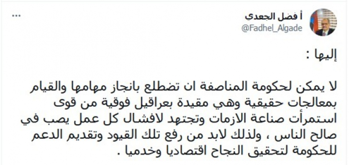 وطالب في تغريدة عبر "تويتر"، اليوم، بضرورة: "رفع تلك القيود وتقديم الدعم للحكومة لتحقيق النجاح اقتصاديا وخدميا".