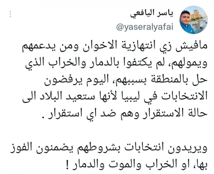 اليافعي: الإخوان يرفضون الانتخابات في ليبيا لمنع استقرارها
