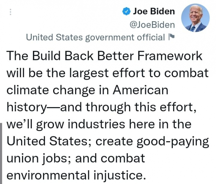 وقال في تغريدة على حسابه بموقع التدوين المصغر تويتر، اليوم إن: "خطة إعادة البناء الأفضل تعد أكبر جهد لمكافحة تغير المناخ في التاريخ الأمريكي".