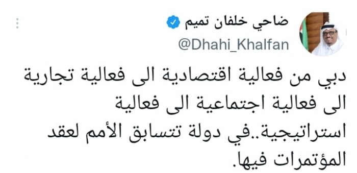 وأوضح في تغريدة على حسابه بموقع التدوين المصغر تويتر، اليوم أن: "دبي من فعالية اقتصادية إلى فعالية تجارية إلى فعالية اجتماعية إلى فعالية استراتيجية"، مؤكدا أنه: "في دولة تتسابق الأمم لعقد المؤتمرات فيها".