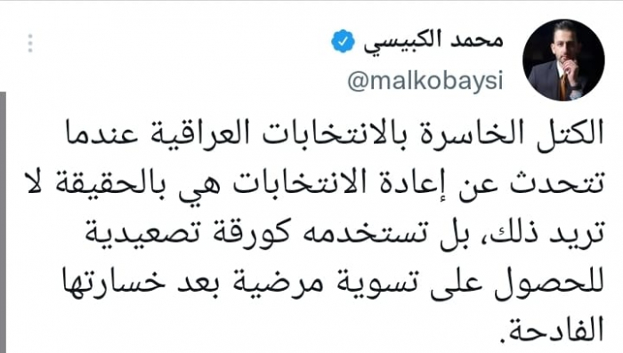 وأشار في تغريدة على حسابه بموقع التدوين المصغر تويتر، اليوم إلى أن: "الكتل الخاسرة بالانتخابات العراقية عندما تتحدث عن إعادة الانتخابات هي بالحقيقة لا تريد ذلك".