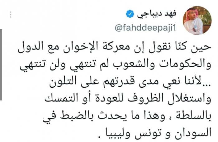 وكشف في تغريدة على حسابه بموقع التدوين المصغر تويتر، اليوم أنه: "حين كنّا نقول إن معركة الإخوان مع الدول والحكومات والشعوب لم تنتهي ولن تنتهي، لأننا نعي مدى قدرتهم على التلون واستغلال الظروف للعودة أو التمسك بالسلطة".