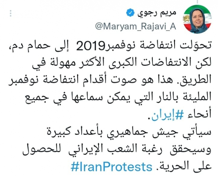 وتابعت: "هذا هو صوت أقدام انتفاضة نوفمبر المليئة بالنار التي يمكن سماعها في جميع أنحاء إيران، سيأتي جيش جماهيري بأعداد كبيرة وسيحقق رغبة الشعب الإيراني للحصول على الحرية".