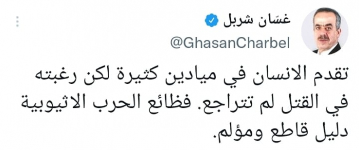 واعتبر في تغريدة على حسابه بموقع التدوين المصغر تويتر، اليوم أن: "تقدم الإنسان في ميادين كثيرة لكن رغبته في القتل لم تتراجع"، مشيرا إلى: "فظائع الحرب الاثيوبية دليل قاطع ومؤلم".