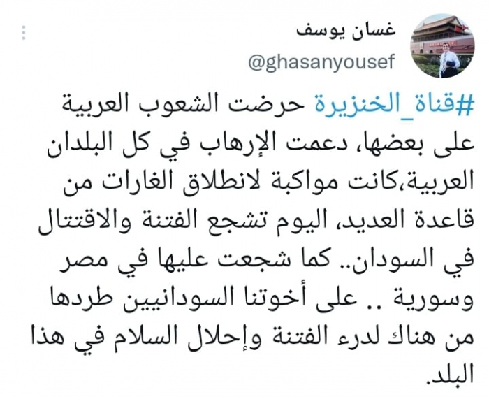 أشار المحلل السياسي غسان يوسف إلى استمرار قناة الجزيرة القطرية في تأليب الشعوب العربية، محذرا من بثها الفتن في السودان لافتعال حرب أهلية.
