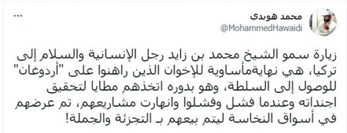 أوضح ذلك في تغريدة عبر "تويتر"، اليوم، قائلا: "زيارة سمو الشيخ محمد بن زايد رجل الإنسانية والسلام إلى تركيا، هي نهاية مأساوية للإخوان الذين راهنوا على أردوغان للوصول إلى السلطة".