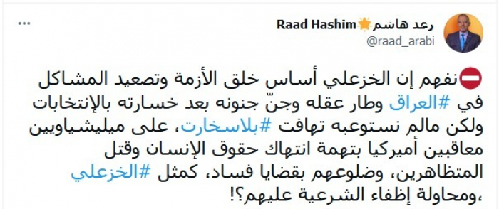 وبيّن في تغريدة عبر "تويتر"، اليوم: "نفهم أن قيس الخزعلي أساس خلق الأزمة وتصعيد المشاكل في العراق وطار عقله وجنّ جنونه بعد خسارته بالانتخابات".