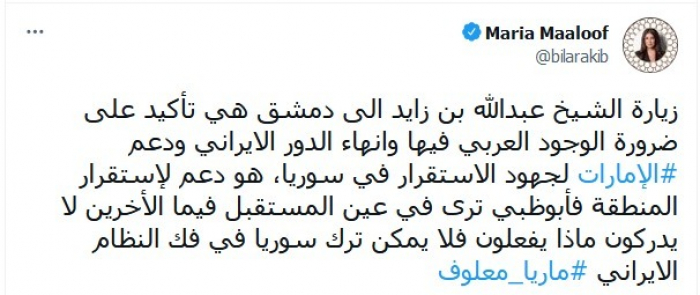 وذكرت في تغريدة عبر "تويتر"، اليوم: "زيارة الشيخ عبدالله بن زايد إلى دمشق هي تأكيد على ضرورة الوجود العربي فيها وإنهاء الدور الإيراني ودعم الإمارات لجهود الاستقرار في سوريا".