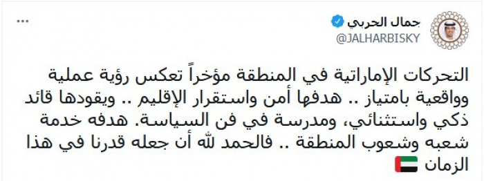 وبيّن في تغريدة عبر "تويتر"، اليوم: "التحركات الإماراتية في المنطقة مؤخرا تعكس رؤية عملية وواقعية بامتياز.. هدفها أمن واستقرار الإقليم".