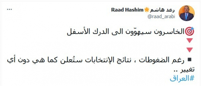 وأكد في تغريدة عبر "تويتر"، اليوم: "الخاسرون سيهوّون الى الدرك الأسفل"متابعا: "رغم الضغوطات، نتائج الانتخابات ستُعلن كما هي دون أي تغيير"، مختتمة تغريدته بهاشتاج: "العراق".