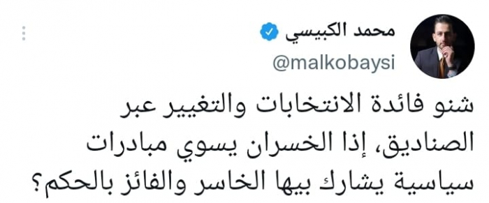 وتساءل في تغريدة على حسابه بموقع التدوين المصغر تويتر، اليوم: "شنو فائدة الانتخابات والتغيير عبر الصناديق، إذا الخسران يسوي مبادرات سياسية يشارك بيها الخاسر والفائز بالحكم؟".