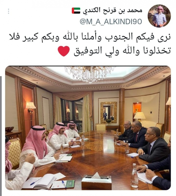 نشر الكاتب الصحفي محمد الكندي، صورة لقاء جمع وفد المجلس الانتقالي الجنوبي في العاصمة السعودية الرياض، مؤكدا أنهم يمثلون الجنوب.