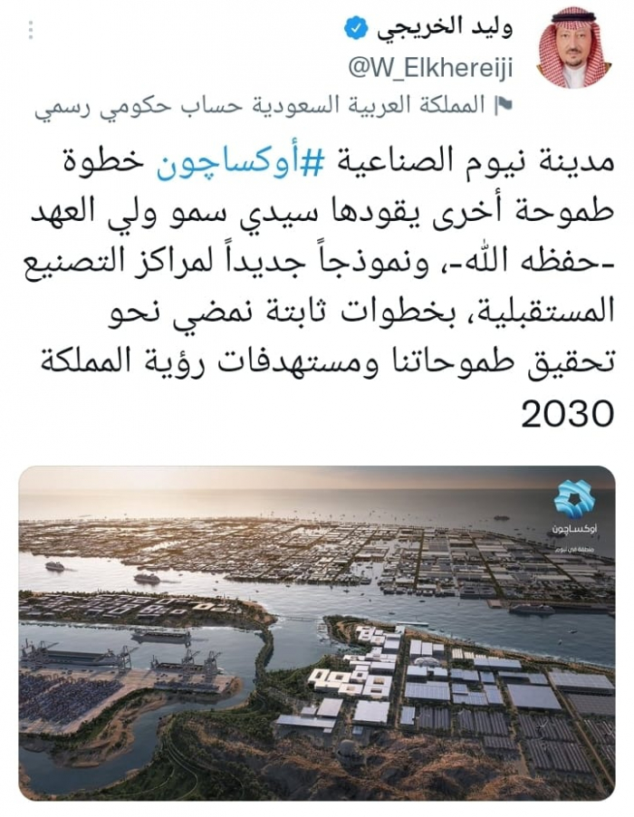 وأشاد في تغريدة على حسابه بموقع التدوين المصغر تويتر، اليوم بمشروع: "مدينة نيوم الصناعية أوكساجون".