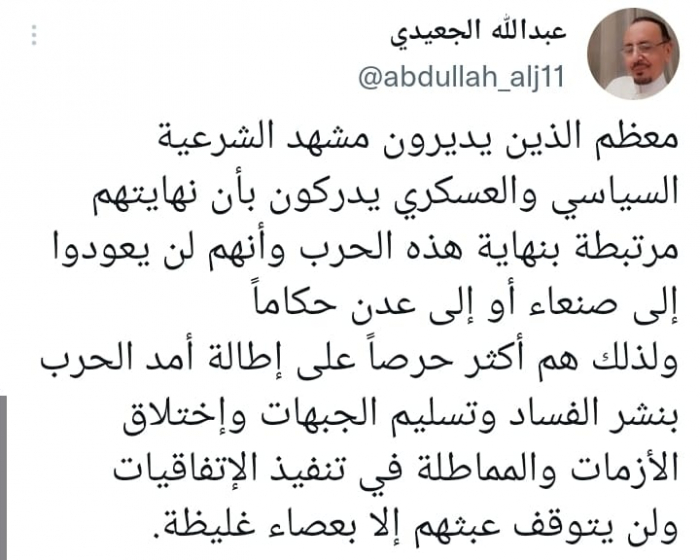 وشدد في تغريدة على حسابه بموقع التدوين المصغر تويتر، اليوم على أن: "معظم الذين يديرون مشهد الشرعية السياسي والعسكري يدركون بأن نهايتهم مرتبطة بنهاية هذه الحرب، وأنهم لن يعودوا إلى صنعاء أو إلى عدن حكاما".