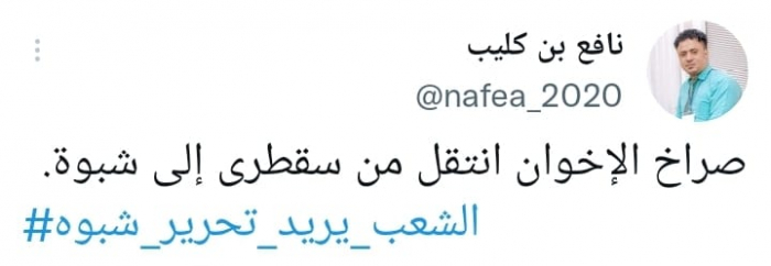 وقال في تغريدة على حسابه بموقع التدوين المصغر تويتر، اليوم إن: "صراخ الإخوان انتقل من سقطرى إلى شبوة"، مختتما بهاشتاج: "الشعب يريد تحرير شبوة".