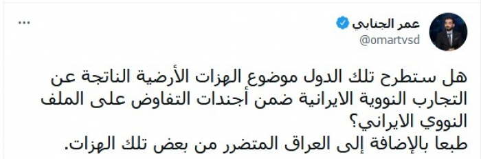 تحدث الكاتب الصحفي العراقي عمر الجنابي، عن الهزات الأرضية الأخيرة التي شهدتها عدة مناطق بإيران، ووصل تأثيرها إلى دول الخليج، قائلا إنها ناتجة عن تجارب نووية.