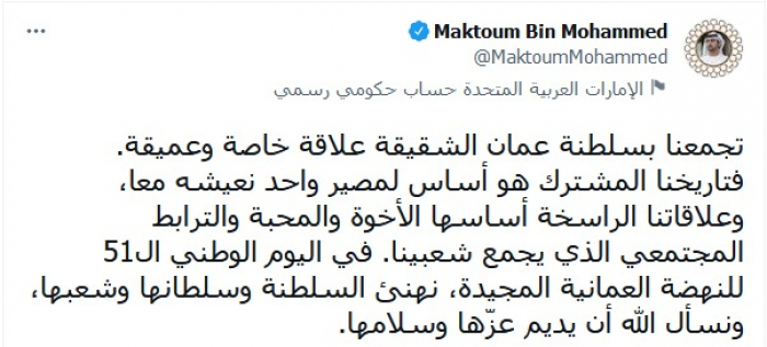 وواصل في تغريدة عبر "تويتر"، اليوم: "في اليوم الوطني الـ51 للنهضة العمانية المجيدة، نهنئ السلطنة وسلطانها وشعبها، ونسأل الله أن يديم عزّها وسلامها".
