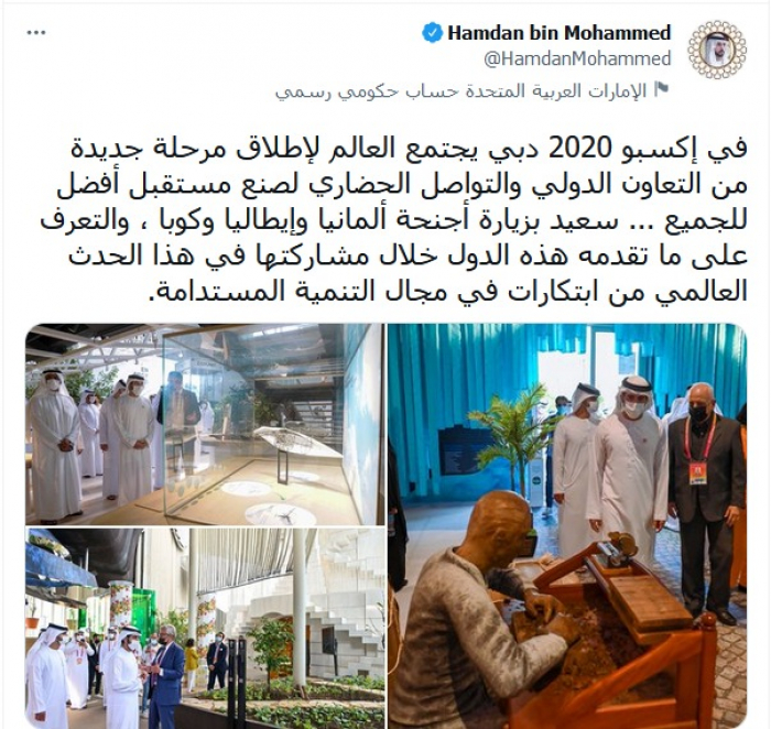 زار الشيخ حمدان بن محمد بن راشد آل مكتوم، ولي عهد دبي، رئيس المجلس التنفيذي لإمارة دبي، أجتحة 3 دول بمعرض إكسبو 2020 في دبي.