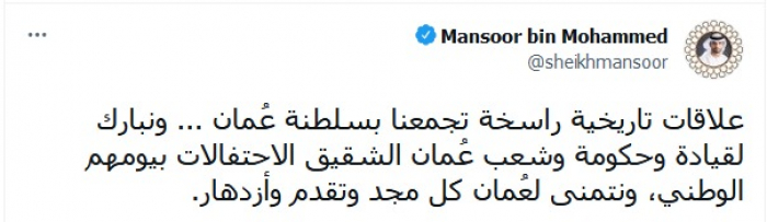 وكتب في تغريدة عبر "تويتر"، اليوم: "علاقات تاريخية راسخة تجمعنا بسلطنة عُمان.. ونبارك لقيادة وحكومة وشعب عُمان الشقيق الاحتفالات بيومهم الوطني، ونتمنى لعُمان كل مجد وتقدم وازدهار".