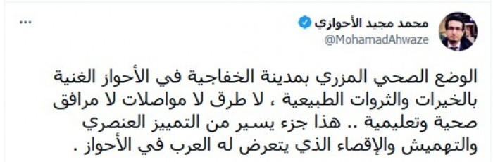 وتابع: "هذا جزء يسير من التمييز العنصري والتهميش والإقصاء الذي يتعرض له العرب في الأحواز".