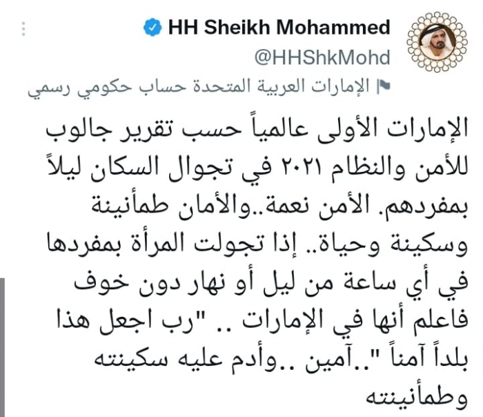 وقال في تغريدة على حسابه بموقع التدوين المصغر تويتر، اليوم إن: "الإمارات الأولى عالميا حسب تقرير جالوب للأمن والنظام ٢٠٢١ في تجوال السكان ليلاً بمفردهم".