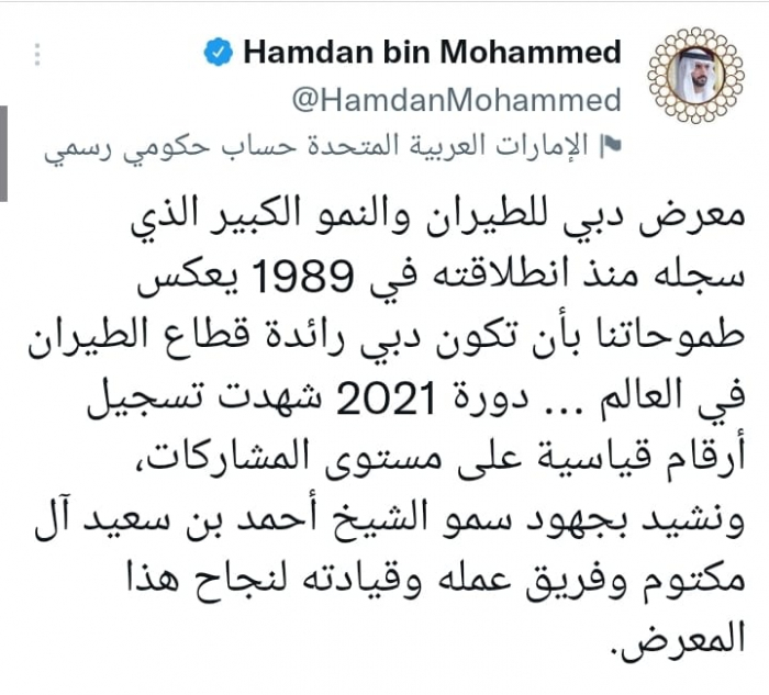 ورأى في تغريدة على حسابه بموقع التدوين المصغر تويتر، اليوم أن: "معرض دبي للطيران والنمو الكبير الذي سجله منذ انطلاقته في 1989 يعكس طموحاتنا بأن تكون دبي رائدة قطاع الطيران في العالم".