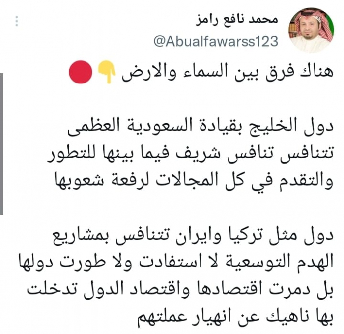 وأشار في تغريدة على حسابه بموقع التدوين المصغر تويتر، اليوم إلى أن: "هناك فرق بين السماء والأرض، دول الخليج بقيادة السعودية العظمى تتنافس تنافس شريف فيما بينها للتطور والتقدم في كل المجالات لرفعة شعوبها".