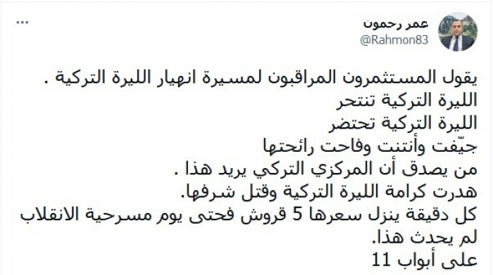 وتساءل: "من يصدق أن المركزي التركي يريد هذا؟"، متسائلا: "هدرت كرامة الليرة التركية وقتل شرفها، كل دقيقة ينزل سعرها 5 قروش فحتى يوم مسرحية الانقلاب لم يحدث هذا.. على أبواب 11".
