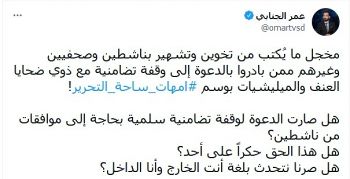 وأبدى تعجبه بشأن: "ما يُكتب من تخوين وتشهير بناشطين وصحفيين وغيرهم ممن بادروا بالدعوة إلى وقفة تضامنية مع ذوي ضحايا العنف والمليشيات بوسم (أمهات ساحة التحرير)".