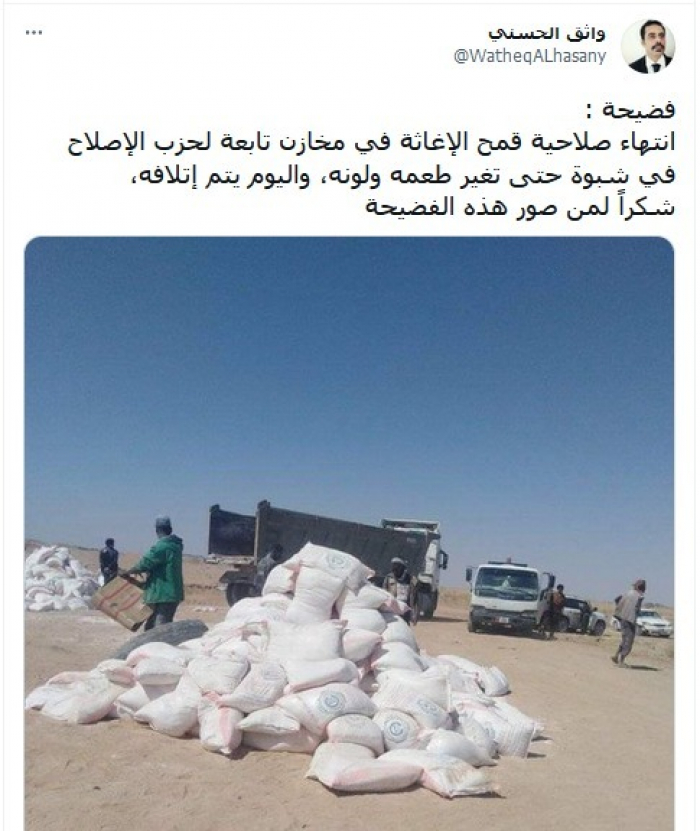 وكتب في تغريدة عبر "تويتر"، اليوم: "فضيحة.. انتهاء صلاحية قمح الإغاثة في مخازن تابعة لحزب الإصلاح في شبوة حتى تغير طعمه ولونه، واليوم يتم إتلافه".