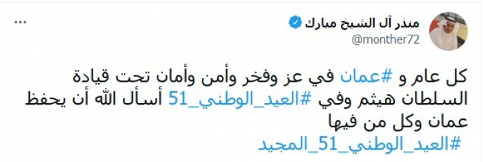 وكتب في تعريدة عبر "تويتر", اليوم: "كل عام وعمان في عز وفخر وأمن وأمان تحت قيادة السلطان هيثم، وفي العيد الوطني 51 أسأل الله أن يحفظ عمان وكل من فيها".