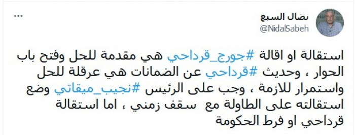 وطالب في تغريدة عبر "تويتر"، اليوم: "وجب على نجيب ميقاتي وضع استقالته على الطاولة مع سقف زمني.. إما استقالة قرداحي وإما فرط الحكومة".