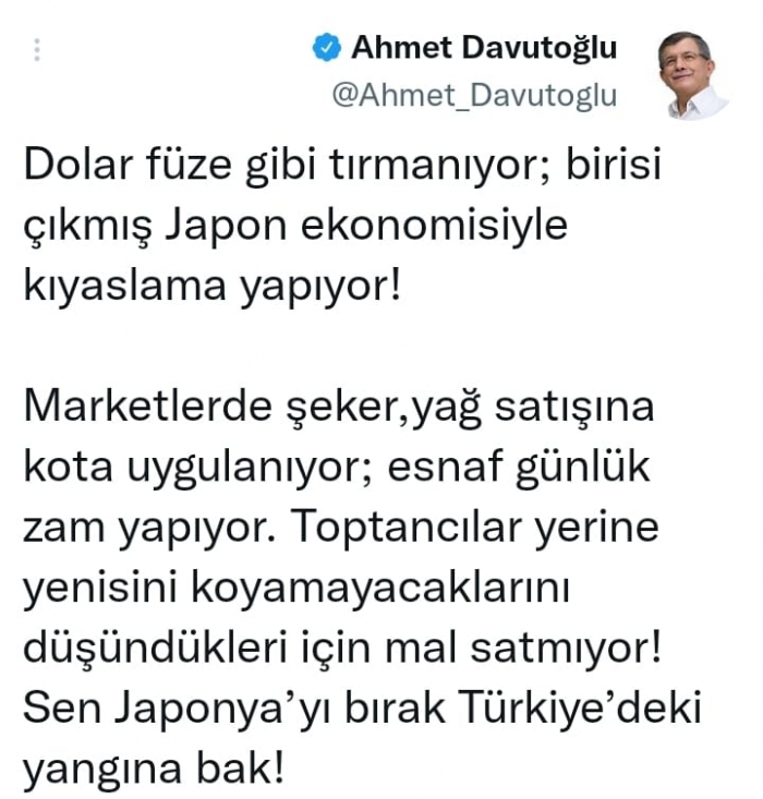 استنكر السياسي التركي البارز أحمد داوود أوغلو، انهيار الليرة أمام الدولار، ساخرا من مقارنة الرئيس رجب طيب أردوغان للاقتصاد التركي بالاقتصاد الياباني.