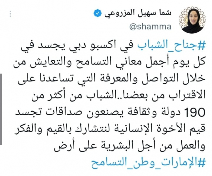وكتبت في تغريدة على حسابها بموقع التدوين المصغر تويتر، اليوم أن: "جناح الشباب في إكسبو دبي يجسد في كل يوم أجمل معاني التسامح والتعايش من خلال التواصل والمعرفة التي تساعدنا على الاقتراب من بعضنا".