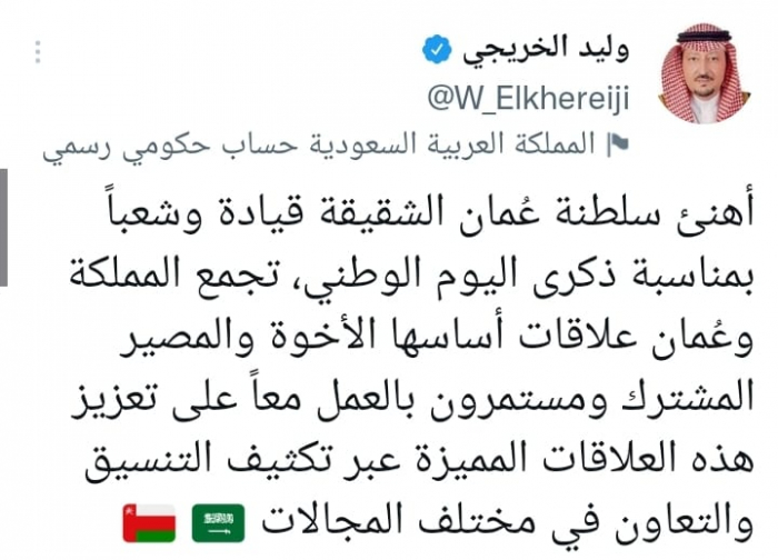 هنأ نائب وزير الخارجية السعودي وليد الخريجي، سلطنة عمان بمناسبة احتفالها باليوم الوطني، مشددا على أن علاقات البلدين تتسم بالأخوة.