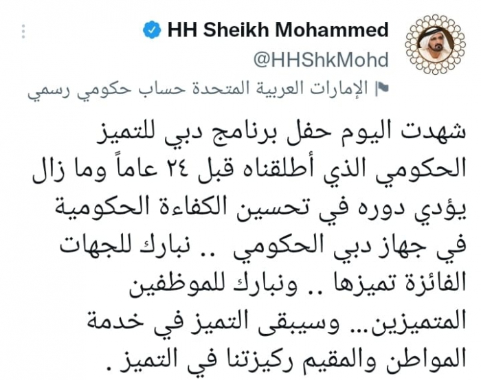 وكشف في تغريدة على حسابه بموقع التدوين المصغر تويتر، اليوم أني: "شهدت اليوم حفل برنامج دبي للتميز الحكومي الذي أطلقناه قبل 24 عاماً وما زال يؤدي دوره في تحسين الكفاءة الحكومية في جهاز دبي الحكومي".