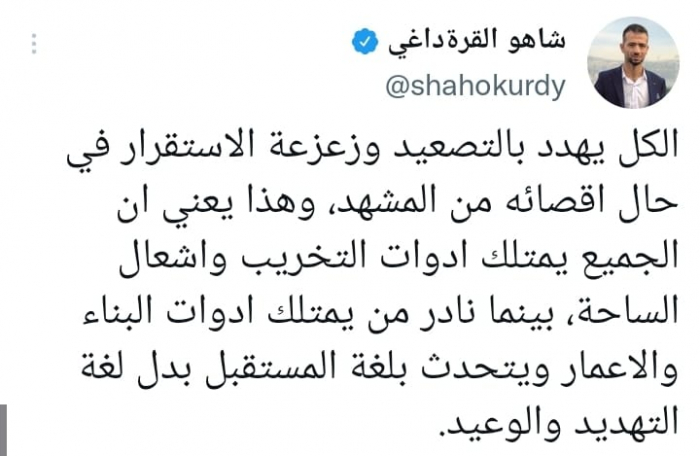 استنكر الكاتب الصحفي شاهو القرة داغي تهديد مختلف القوى السياسية في العراق الموالية لإيران بالتخريب، مؤكدا أنها لا تملك أدوات للتعمير والتنمية.