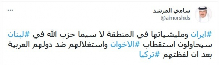 وذكر في تغريدة عبر "تويتر"، اليوم: "إيران ومليشياتها في المنطقة لا سيما حزب الله في لبنان سيحاولون استقطاب الإخوان واستغلالهم ضد دولهم العربية بعد أن لفظتهم تركيا".