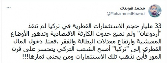 وكشف في تغريدة عبر "تويتر"، اليوم: "33 مليارا حجم الاستثمارات القطرية في تركيا لم تنقذ أردوغان، ولم تمنع حدوث الكارثة الاقتصادية وتدهور الأوضاع المعيشية وارتفاع معدلات البطالة والفقر".