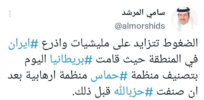 وكتب في تغريدة على حسابه بموقع التدوين المصغر تويتر، اليوم أن: "الضغوط تتزايد على مليشيات وأذرع إيران في المنطقة حيث قامت بريطانيا اليوم بتصنيف منظمة حماس منظمة إرهابية بعد أن صنفت حزب الله قبل ذلك".