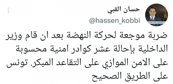 وأشار في تغريدة على حسابه بموقع التدوين المصغر تويتر، اليوم إلى أنها: "ضربة موجعة لحركة النهضة بعد أن قام وزير الداخلية بإحالة عشر كوادر أمنية محسوبة على الأمن الموازي على التقاعد المبكر"، مؤكدا أن: "تونس على الطريق الصحيح".