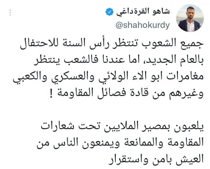 وأكد في تغريدة على حسابه بموقع التدوين المصغر تويتر، اليوم أن: "جميع الشعوب تنتظر رأس السنة للاحتفال بالعام الجديد، أما عندنا فالشعب ينتظر مغامرات أبو الاء الولائي والعسكري والكعبي وغيرهم من قادة الفصائل".