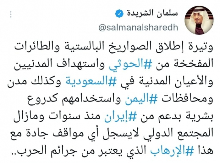 واستنكر في تغريدة على حسابه بموقع التدوين المصغر تويتر، اليوم: "وتيرة إطلاق الصواريخ البالستية والطائرات المفخخة من الحوثي واستهداف المدنيين والأعيان المدنية في السعودية وكذلك مدن ومحافظات اليمن واستخدامهم كدروع بشرية".