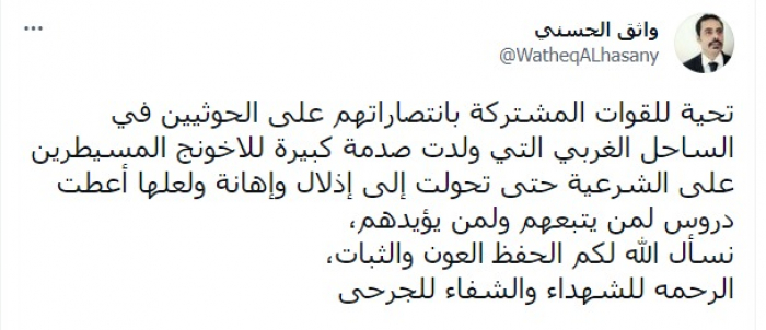 ووجه عبر حسابه على موقع تويتر اليوم السبت: "تحية للقوات المشتركة بانتصاراتهم على الحوثيين في الساحل الغربي التي ولدت صدمة كبيرة للإخونج المسيطرين على الشرعية حتى تحولت إلى إذلال وإهانة".