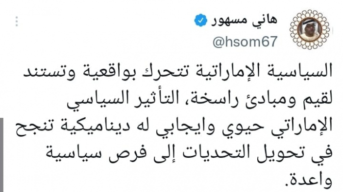 أشار الكاتب الصحفي هاني مسهور إلى اعتماد دولة الإمارات العربية المتحدة على سياسة تنهض على أسس عميقة الجذور تسمح بتأثير قوى للإمارات إقليميا ودوليا.