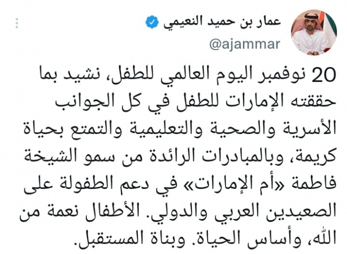 وأشار في تغريدة على حسابه بموقع التدوين المصغر تويتر، اليوم إلى أنه في: "20 نوفمبر اليوم العالمي للطفل، نشيد بما حققته الإمارات للطفل في كل الجوانب الأسرية والصحية والتعليمية والتمتع بحياة كريمة".