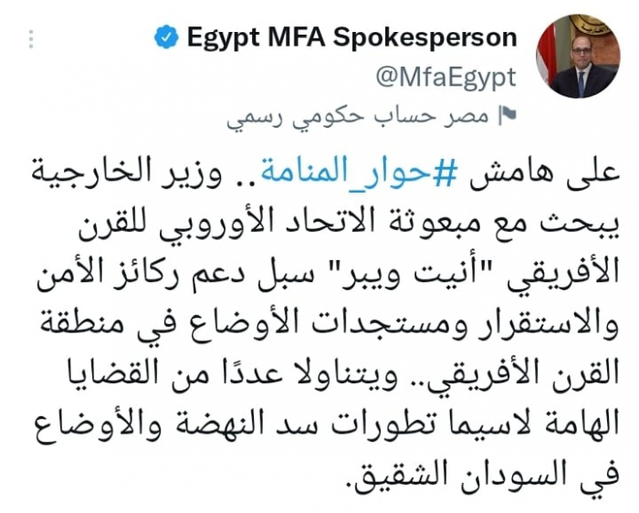 وكشف حساب المتحدث باسم الخارجية المصرية في تغريدة على حسابه بموقع التدوين المصغر تويتر، اليوم أنه: "على هامش حوار المنامة، وزير الخارجية يبحث مع مبعوثة الاتحاد الأوروبي للقرن الأفريقي (أنيت ويبر) سبل دعم ركائز الأمن والاستقرار ومستجدات الأوضاع في منطقة القرن الأفريقي".