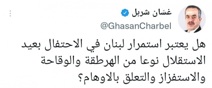 وتساءل في تغريدة على حسابه بموقع التدوين المصغر تويتر، اليوم: "هل يعتبر استمرار لبنان في الاحتفال بعيد الاستقلال نوعا من الهرطقة والوقاحة والاستفزاز والتعلق بالأوهام؟".