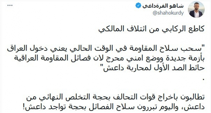 انتقد الكاتب الصحفي العراقي شاهو القرة داغي، سياسة التناقض لمليشيات إيران في العراق، التي تطالب بإخراج قوات التحالف الدولي بحجة التخلص من تنظيم داعش الإرهابي، وفي الوقت نفسه تبرر وجود سلاحها بحجة تواجد داعش.