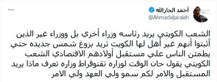 واستكمل في تغريدة عبر "تويتر"، اليوم: "الشعب الكويتي يقول حان الوقت لوزاره تكنوقراط، وزارة تعرف ماذا يريد المستقبل والأمر لكم سمو ولي العهد ولي الأمر".